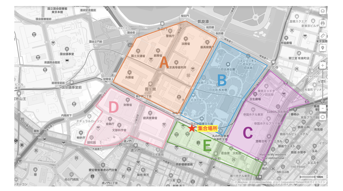 清掃は、チームスピリットのオフィス周辺の霞が関の官庁街から日比谷公園、内幸町、有楽町まで幅広いエリアを、チームごとに分かれて行います。